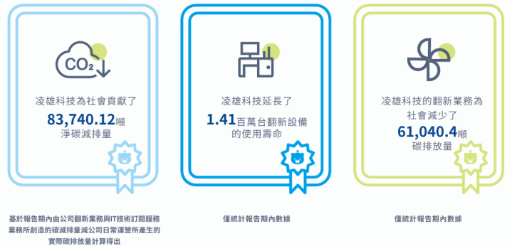 由此,与传统的一次性采购模式相⽐,凌雄科技的设备全生命周期管理业务模式能够有效减少单台设备年均碳排放量。同时,通过对回收设备进行翻新处理,可以有效延长设备的使用周期,减少了企业在运营过程中对全新设备的需求量,从而进一步降低了整体社会碳排放⽔平,进而为推动低碳经济和可持续发展目标作出了积极贡献。报告期内,凌雄科技为社会贡献的净碳减排量达83740.12吨。