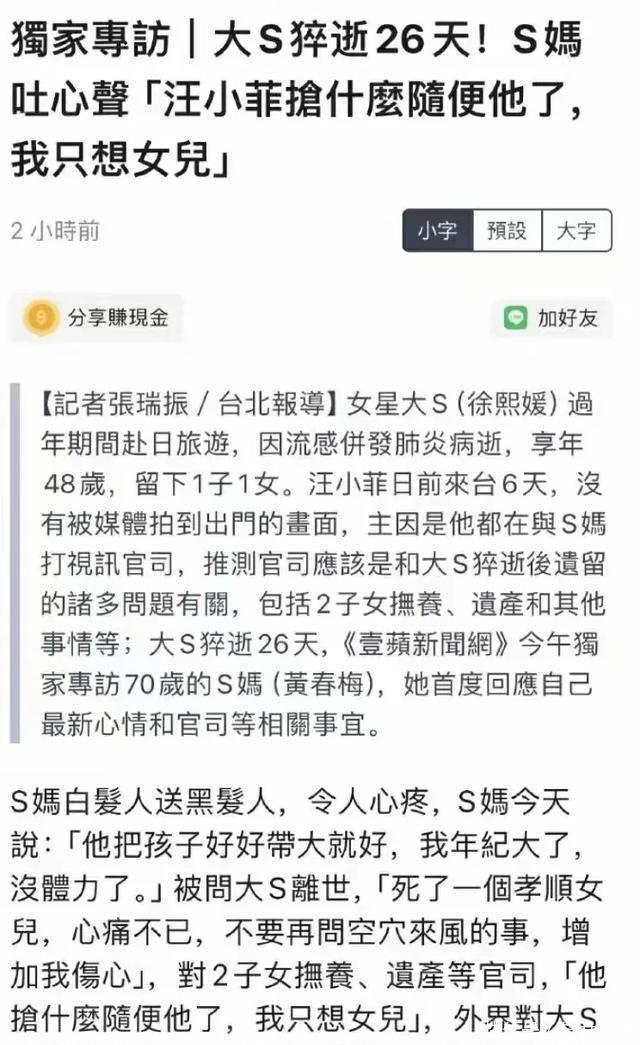 2025年2月2日,华语影视演员、女歌手大S在日本旅游猝死后,整整27天了。 这27天来,有关大S的真正死因,遗产分配,还有两个孩子抚养权的归属问题,一直传得沸沸扬扬,愈吵愈烈。 尤其是大S的妈妈,为了“捍卫”自己的权益,不惜赤膊上阵,发誓要和汪小菲“战斗到底”! 没有想到,就在2月份最后一天,大S妈妈面对采访时,说了一番话,太出人意料,还恳求汪小菲一件事。